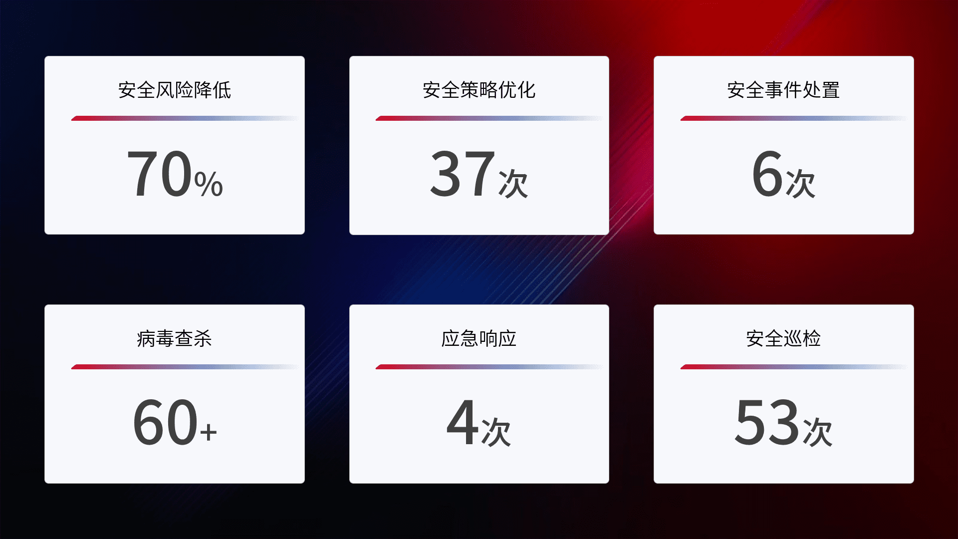 提供全面的安全事件报告体系,,,,包括处置报告、、、周报、、、季度和年度总结,,,结合持续监控,,,,帮助客户深入了解网络安全状况。。。。